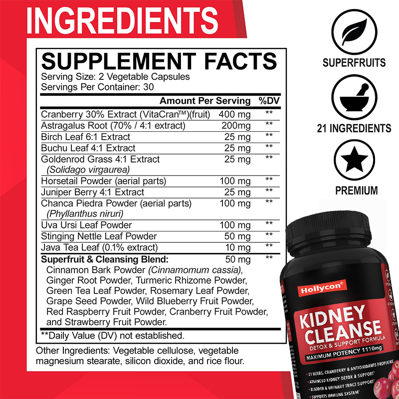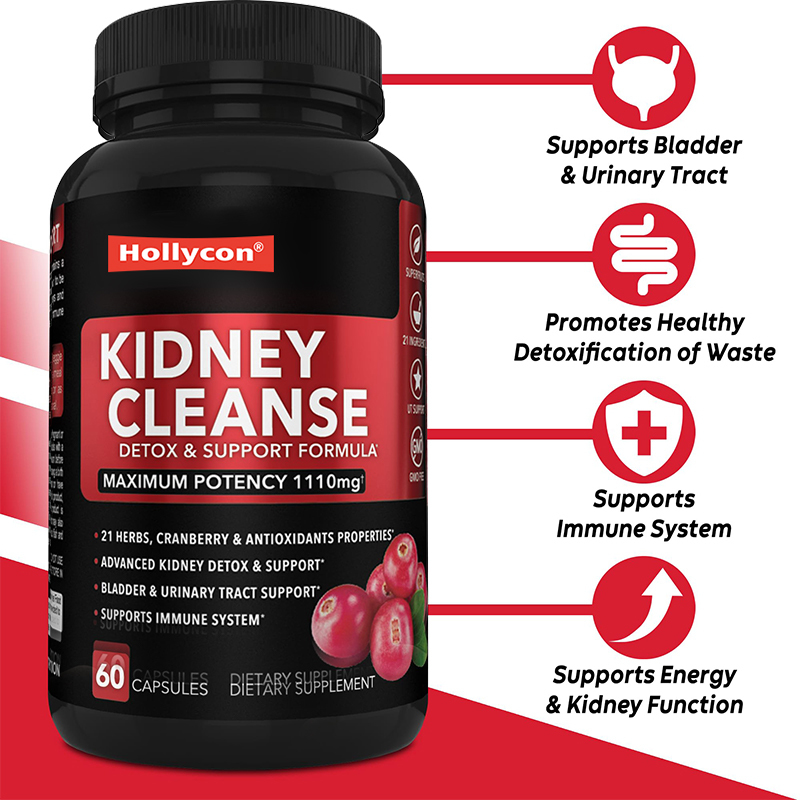 La fórmula natural de Hollycon de extractos de hierbas estimula una desintoxicación premium para un apoyo adecuado y efectivo de la vejiga y la función de salud renal.
