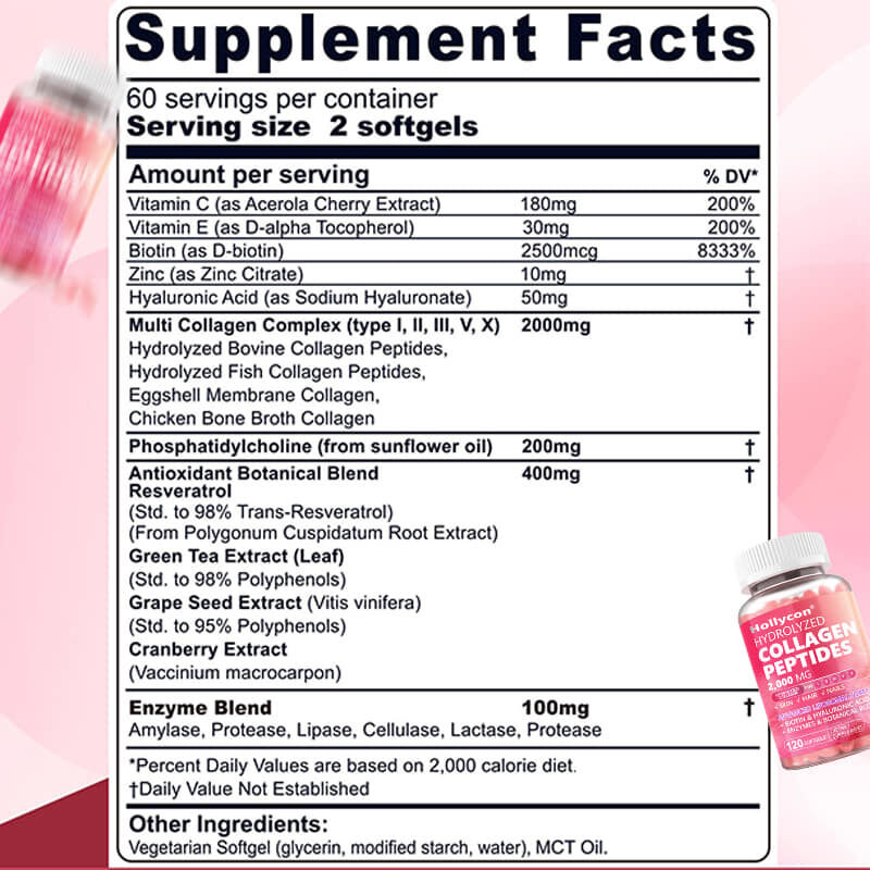 El suplemento de colágeno multi-Hollycon proporciona péptidos de colágeno hidrolizados de los tipos I, II, III,V y X para ayudarte a lograr belleza y vitalidad desde adentro hacia afuera reequilibrando los niveles naturales de colágeno y aumentando los antioxidantes¡Siéntete mejor en cualquier etapa!